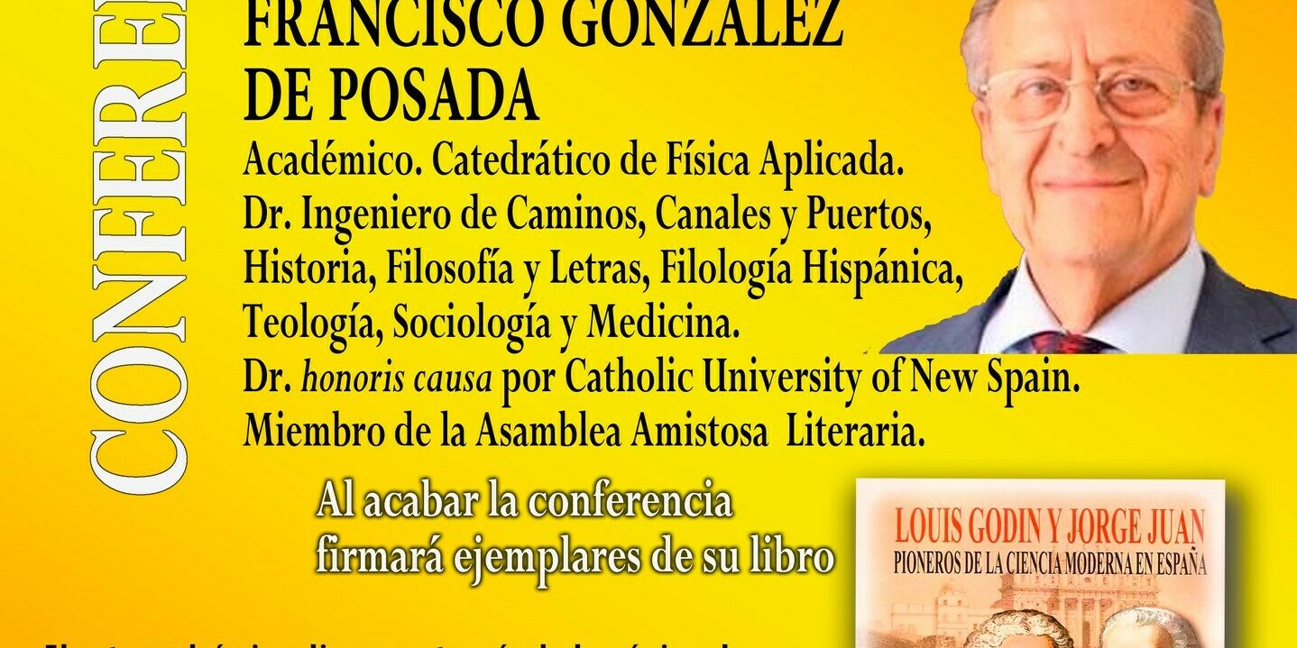 La Asamblea Amistosa Literaria de Novelda cierra el ciclo de actividades programadas para conmemorar el 252 aniversario de la muerte de Jorge Juan con la conferencia LOUIS GODIN, DE MAESTRO A COLABORADOR DE JORGE JUAN que impartirá el Excmo. Sr. D. Francisco González de Posada, Académico. Catedrático de Física Aplicada. Dr. Ingeniero de Caminos, Canales y Puertos, Historia, Filosofía y Letras, Filología Hispánica, Teología, Sociología y Medicina. Dr. honoris causa por Catholic University of New Spain y miembro de la Asamblea Amistosa Literaria.