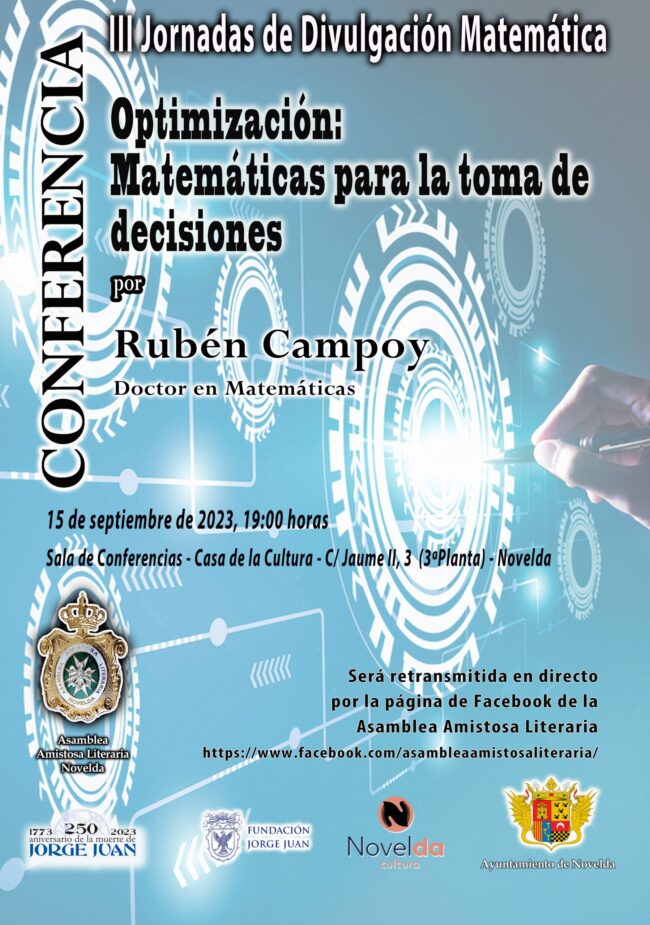 La Asamblea Amistosa Literaria de Novelda continúa con su ciclo de charlas científicas de las III Jornadas de divulgación matemática en el año dedicado a la conmemoración del 250 aniversario de la muerte de Jorge Juan, con la ponencia del profesor noveldense Rubén Campoy “Optimización: Matemáticas para la toma de decisiones”.La conferencia tendrá lugar el…