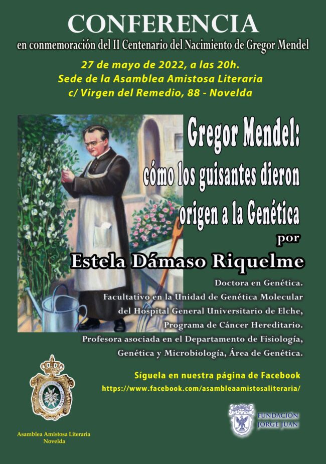 La Asamblea Amistosa Literaria de Novelda retoma la celebración de actividades presenciales en su sede social de la calle Virgen del Remedio,88 de Novelda, conmemorando el II Centenario del Nacimiento de Gregor Mendel con una conferencia que pronunciará Estela Dámaso Riquelme, Doctora en Genética. Facultativo en la Unidad de Genética Molecular del Hospital General Universitario…