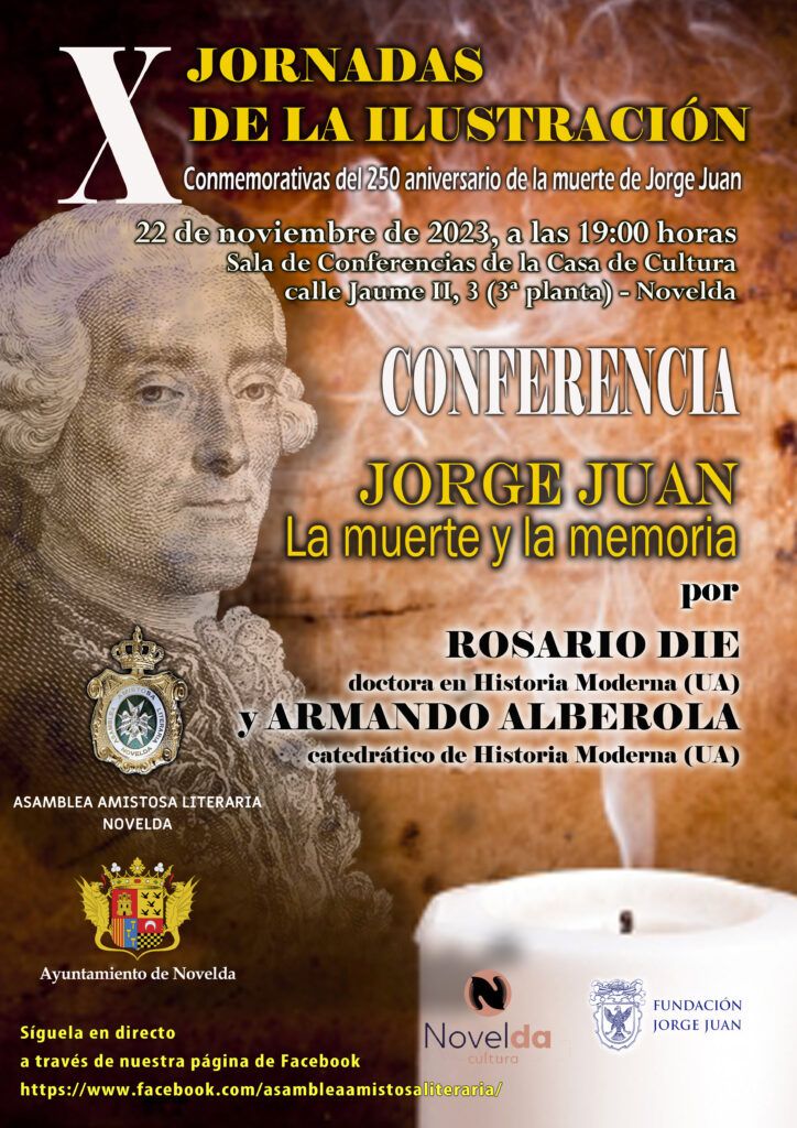 Continúan las X Jornadas de la Ilustración organizadas por la Asamblea Amistosa Literaria en conmemoración del 250 aniversario de la muerte de Jorge Juan con la conferencia JORGE JUAN. LA MUERTE Y LA MEMORIA que impartirán el día 22 de noviembre de 2023, a las 19:00 h., los biógrafos de Jorge Juan, Rosario Die Maculet, doctora de Historia Moderna (UA) y Armando Alberola Romá, catedrático de Historia Moderna (UA), en la sala de conferencias de la Casa de Cultura de Novelda, calle Jaume II, 3, 3ª planta.